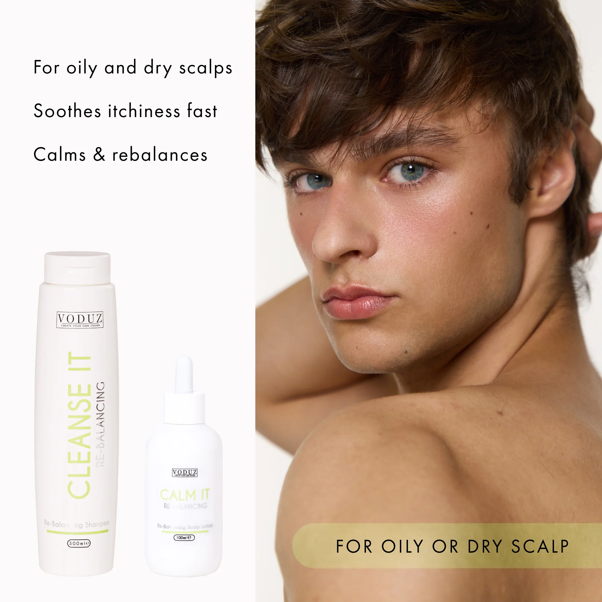 Instantly soothe scalp irritation with Voduz 'Calm It' Re-Balancing Scalp Lotion. This lightweight, cooling lotion absorbs quickly into the scalp, easing redness, itchiness, and discomfort, and leaving your scalp feeling calm and refreshed.